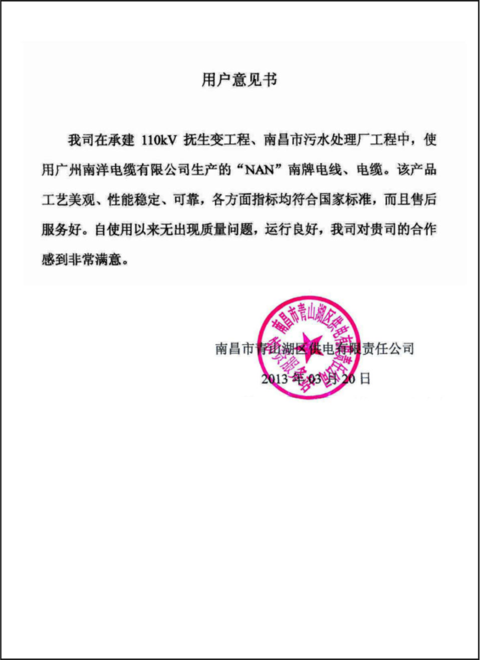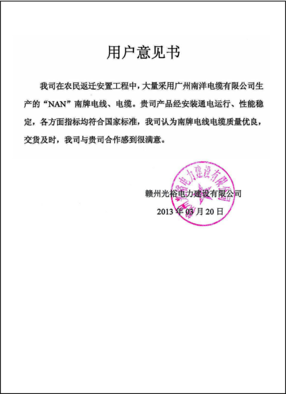 赣州光裕电力用户意见书