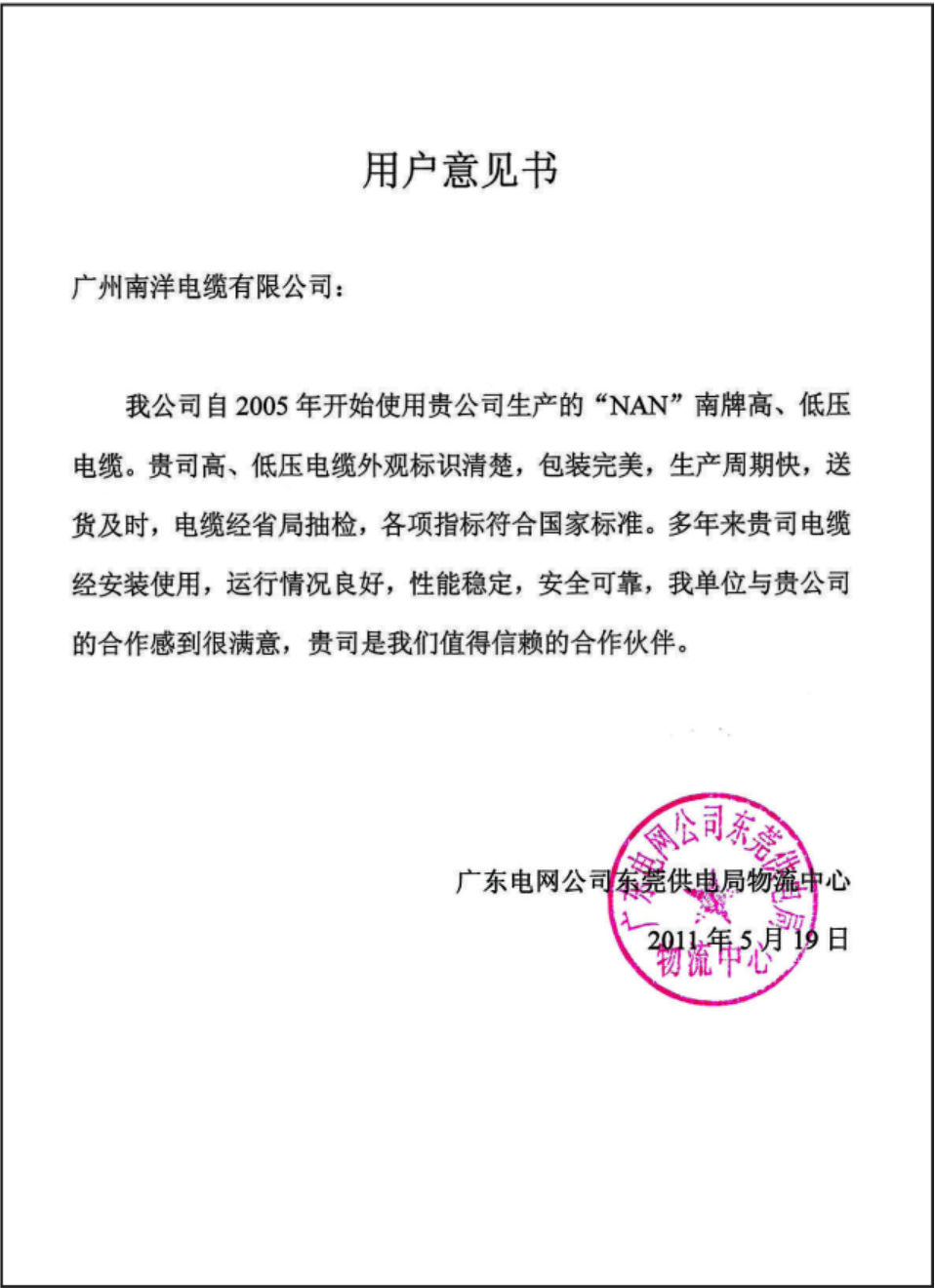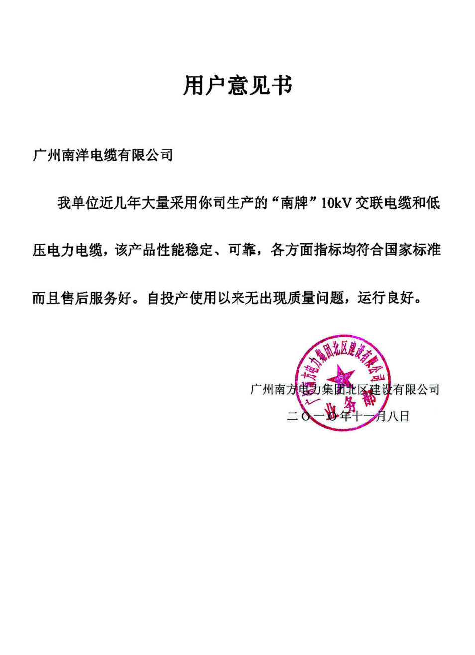 广州南方电力集团北区建设有限公司用户意见书