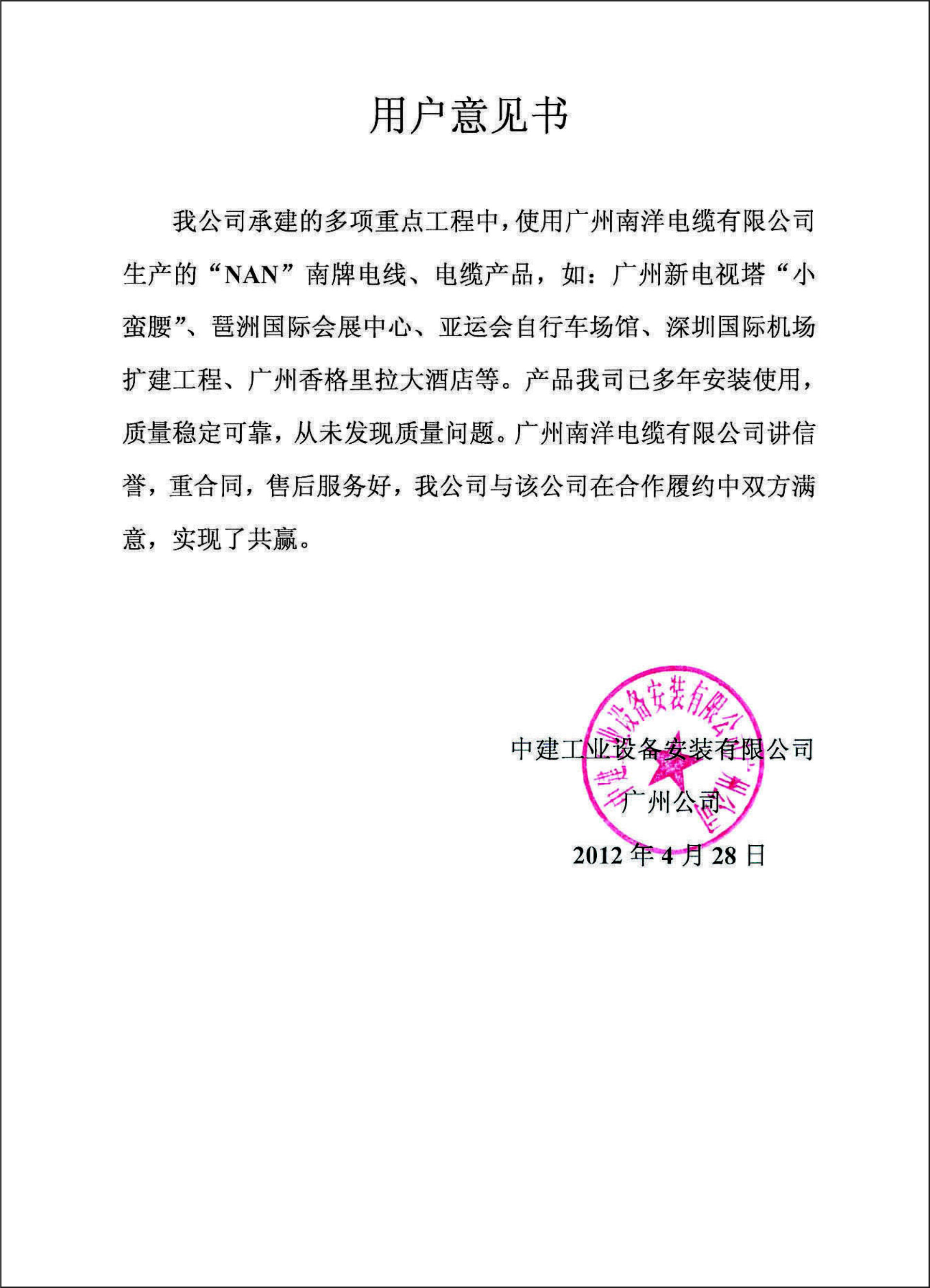 中建安装广州公司用户意见书