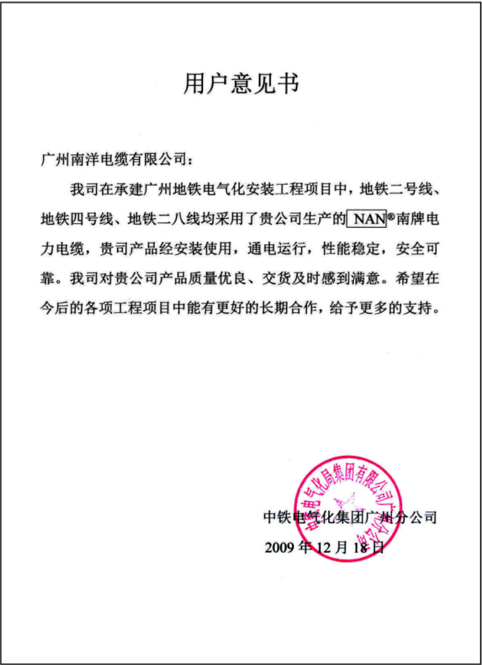 广州地铁电气化安装工程项目用户意见书