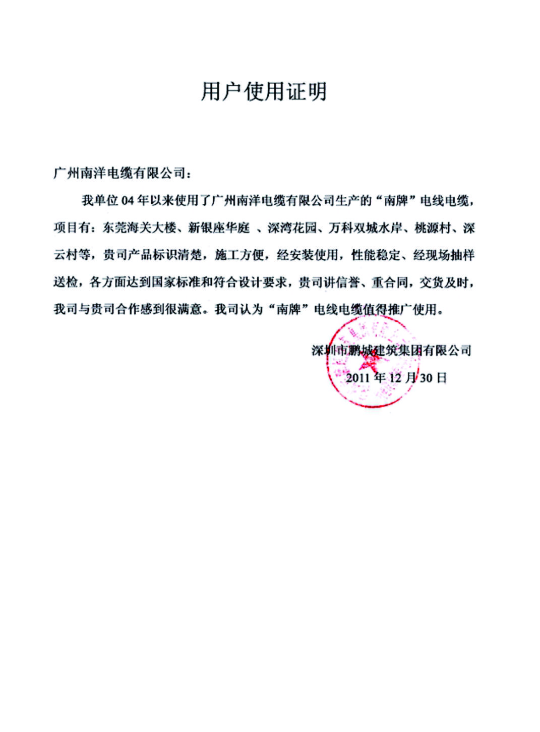 深圳市鹏城建筑集团有限公司用户使用证明