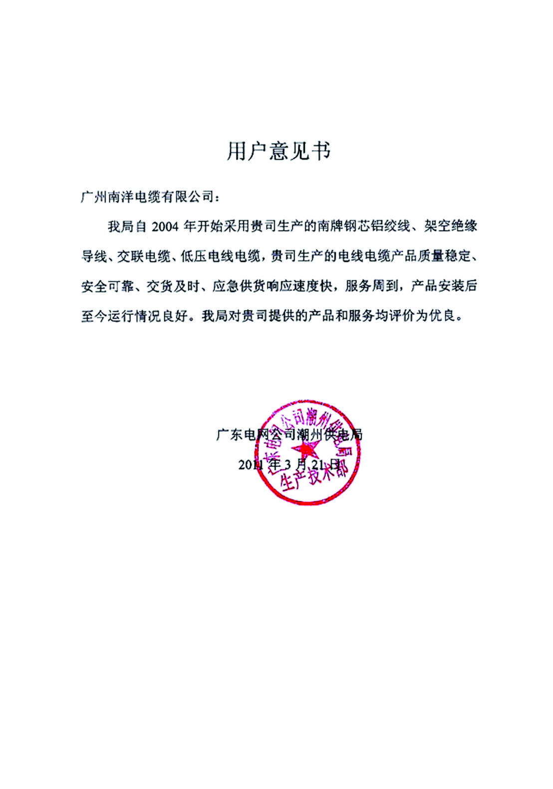 潮州供电局用户意见书