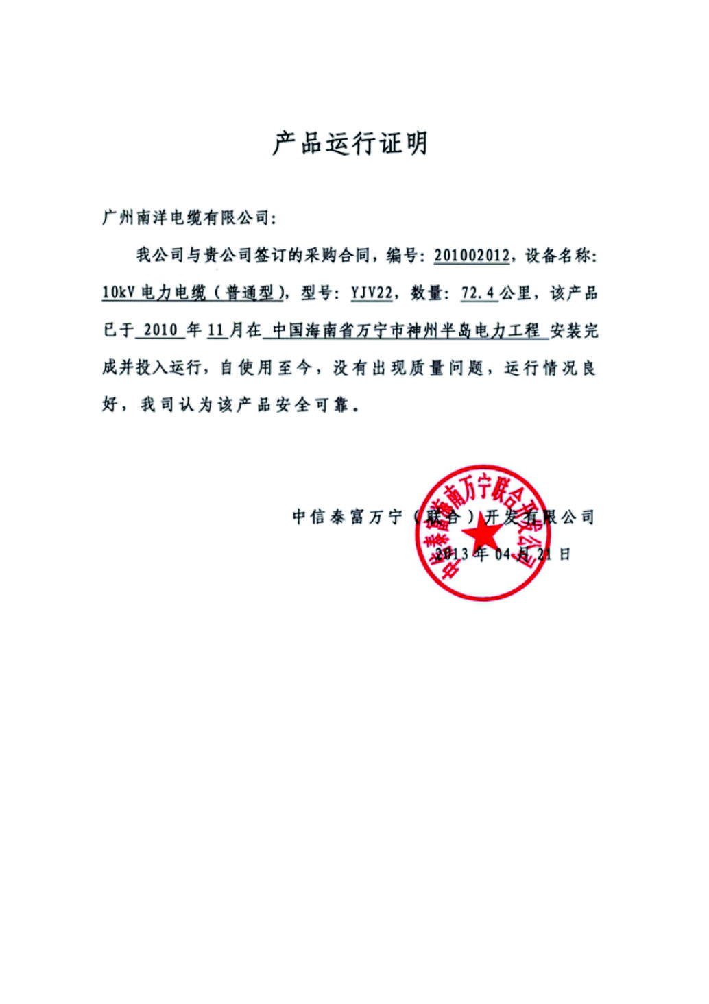 中国海南万宁神州半岛电力工程产品运行证明