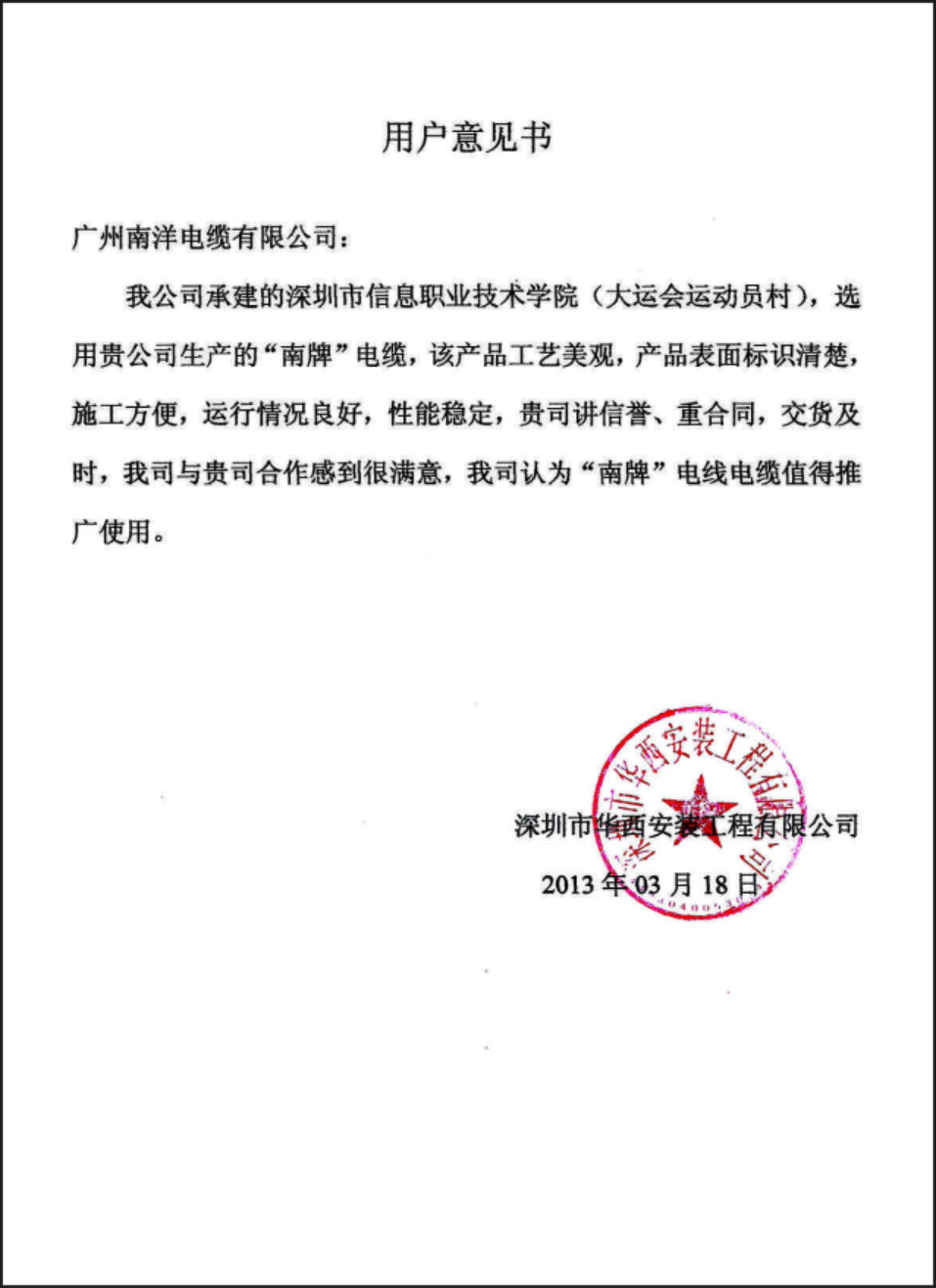 深圳华西用户意见书