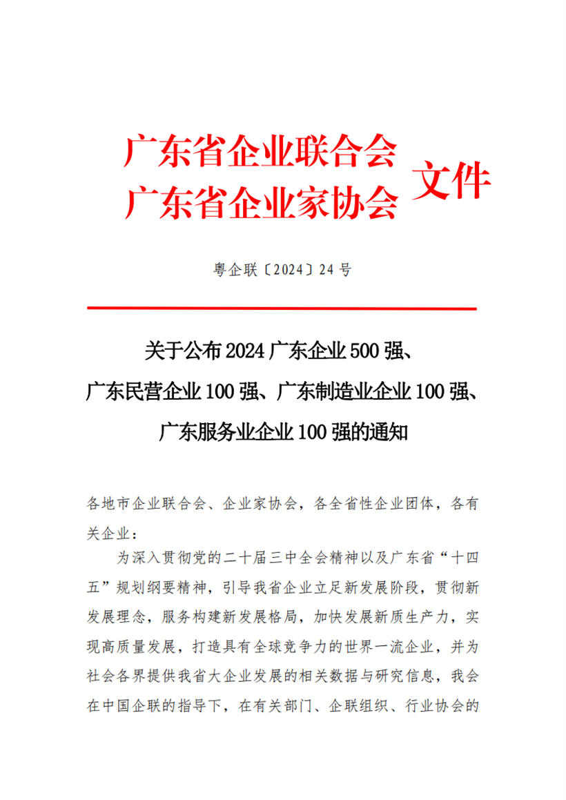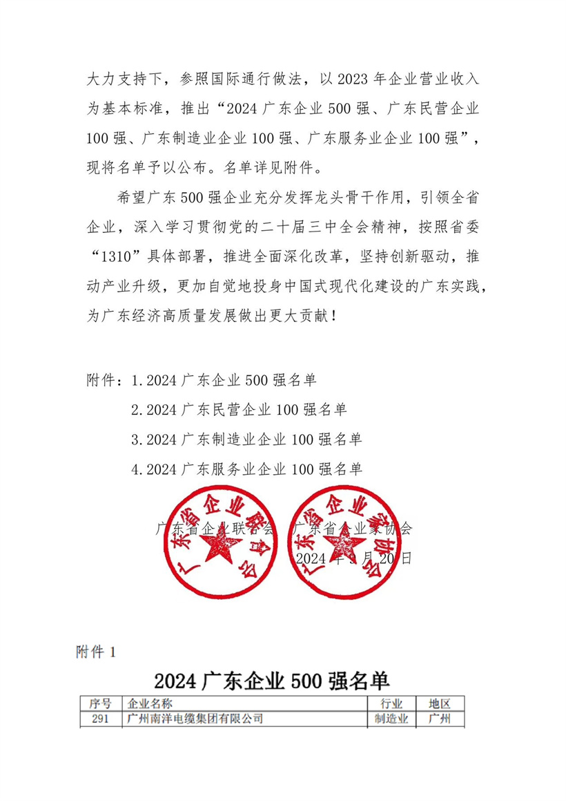 近日,由广东省企业联合会、广东省企业家协会主办的2024广东500强企业发展大会在广州举行。大会以“推进全面深化改革,建设世界一流企业”为主题,正式向社会发布《2024广东500强企业发展报告》,同时发布了“2024广东企业500强”榜单,我司荣获“2024广东企业500强”第291位,排名较上年提升30位。自2019年起我司已连续6年荣登“广东企业500强”榜单,位居广东省线缆产业入选企业第一名。